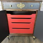 This beautiful piece is beautiful and has tons of storage space. The outside of the piece has been refreshed to a top and frame with a dark walnut stain. The top drawer, doors and sides have been painted black. The door fronts has a raised pattern. The hardware and accents are a stunning gold that really makes this a statement piece for any room. The interior has 4 roomy drawers with red fronts and dark walnut stained interiors and drawer sides. Dimensions are: 36" wide, 20.5" deep, 47.25" tall(at dresser top), 51.5" tall(at back decor piece)