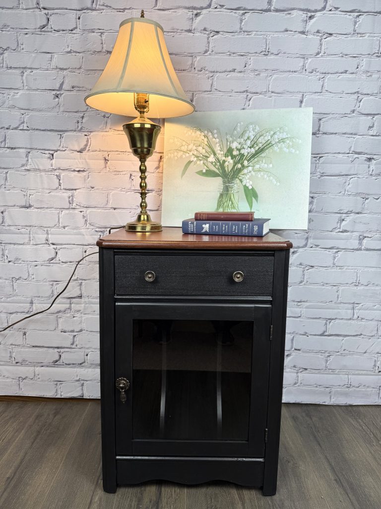 This little side table has been painted black and a rust color. The hardware has been replaced with a cute off-white knob with a hummingbird/flowers as the design. Dimensions: 22" deep, 28" tall, 17" wide( with wings down), 30" wide(with wings up)