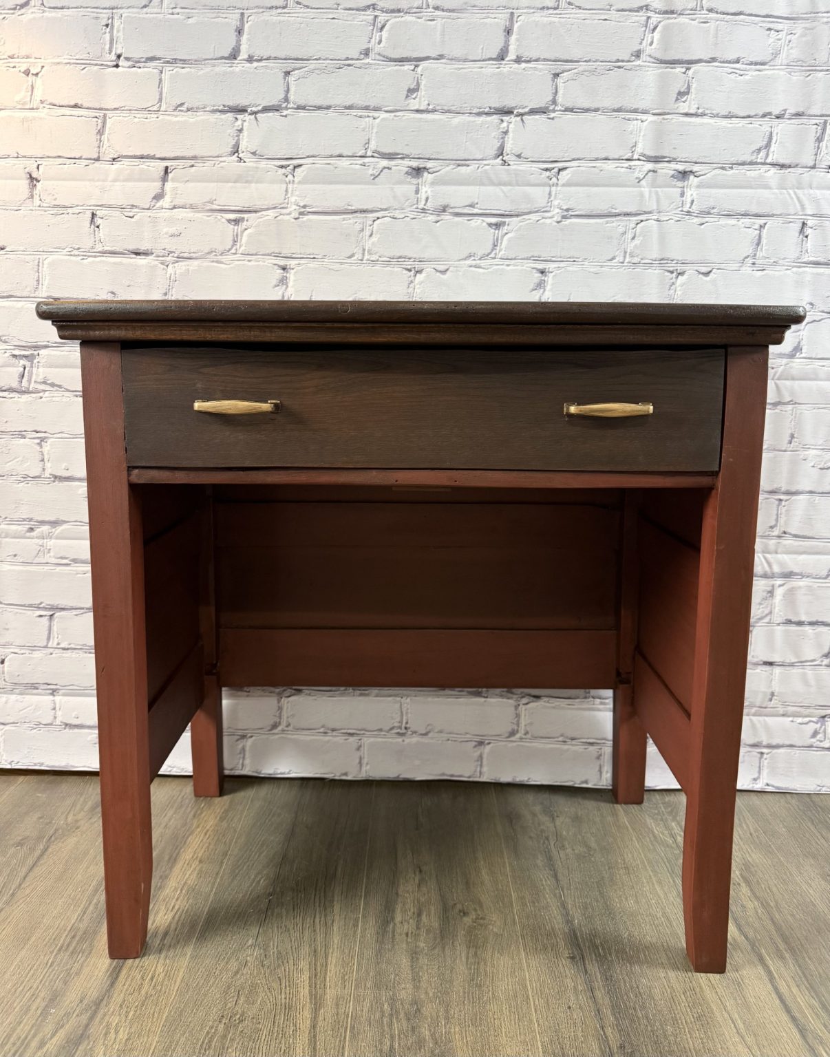 This vintage desk has been refurbished to it's new glory. The base and drawer have been painted black and the top and drawer trim have been stained a rich brown stain. The piece has the original hardware. Dimensions: 30" wide x 18" deep x 30" tall Can be seen in person at: The Picker Knows Antique Mall 1208 Grand Ave West Des Moines Booth #307
